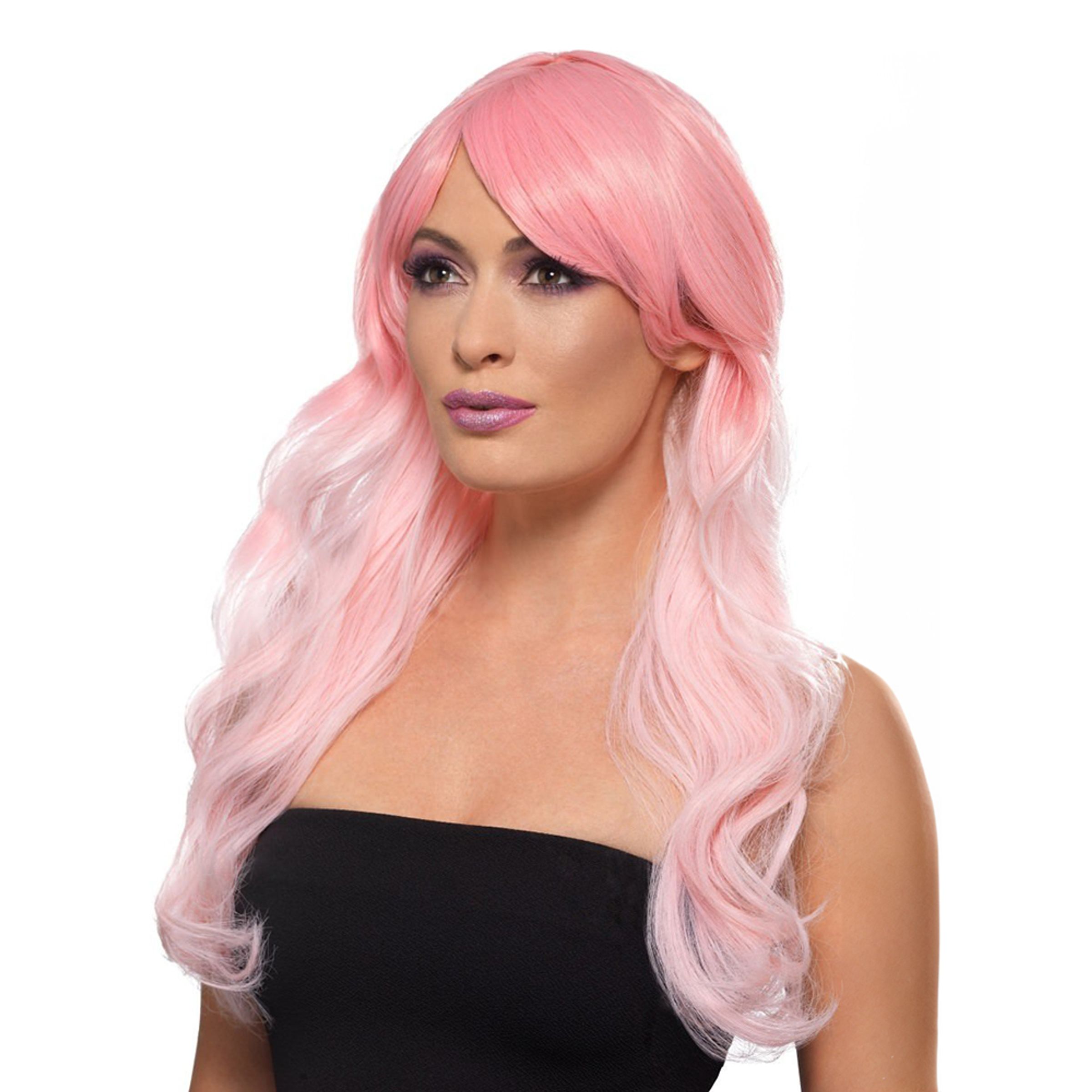 Lång Vågig Ljusrosa Peruk har en ljusrosa färg i topparna som går över till en mörkare rosa uppe på huvudet. Håret räcker ner till bröstet och är vågigt.