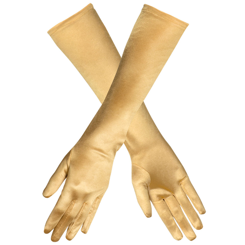 Långa Handskar Guld innehåller ett par långa glansiga handskar i snyggt guld. Handskarna går upp till armbågen. Tillverkade av polyester.
