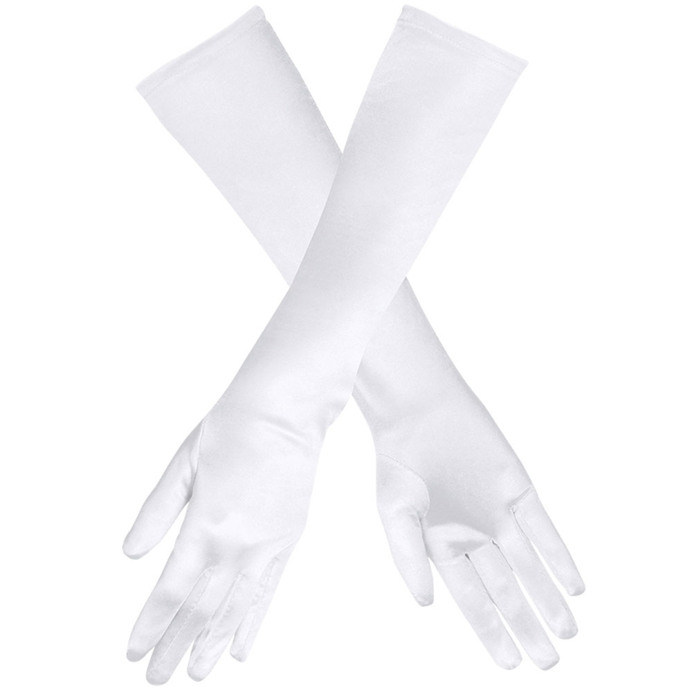Långa Handskar Satin Vit innehåller ett par långa glansiga handskar i vitt. Handskarna går upp till armbågen. Tillverkade av polyester.