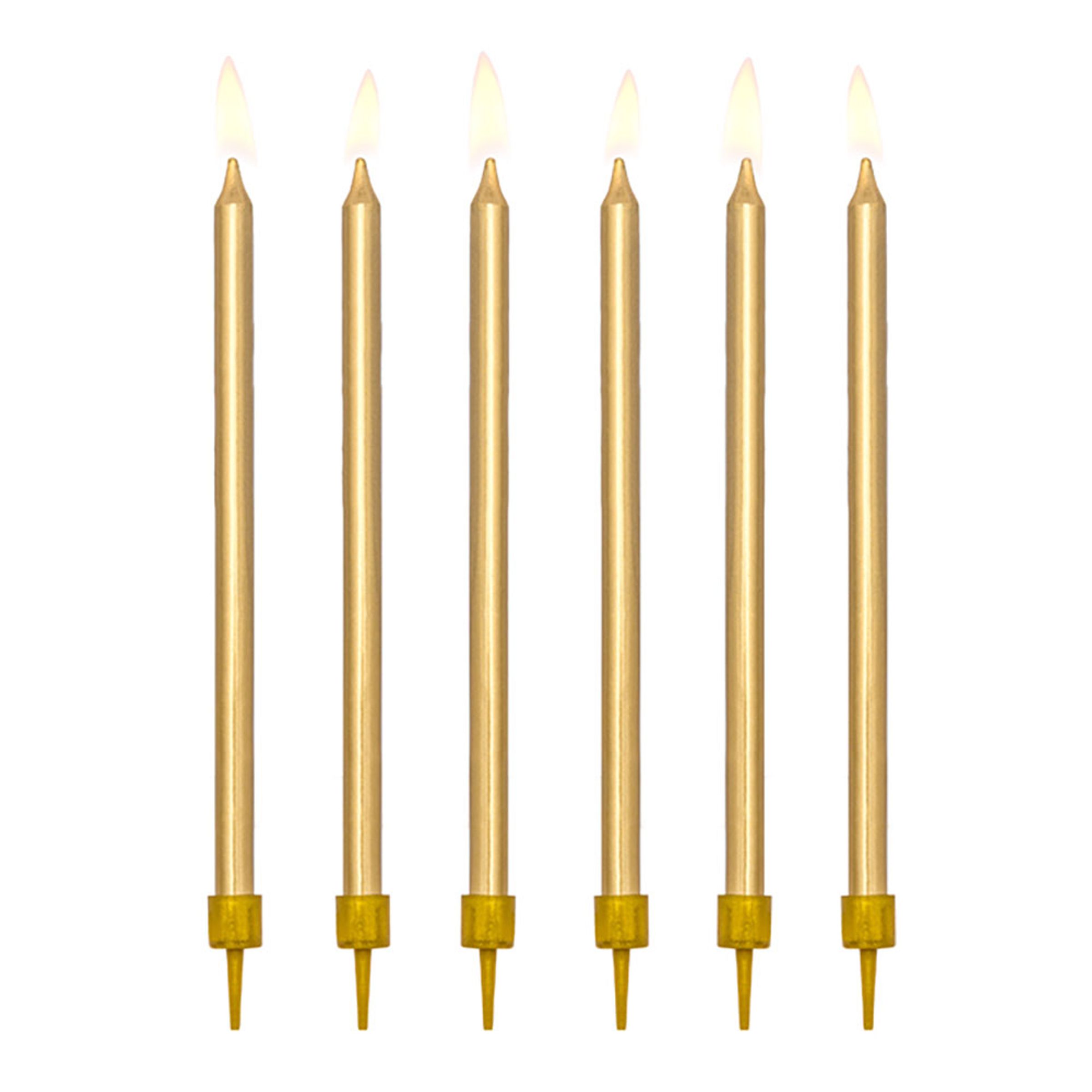 Långa Tårtljus Guld är tolv stycken avlånga ljus som kommer i en metallisk guldfärg. Levereras komplett med hållare i plast som enkelt sticks ner i tårtan.