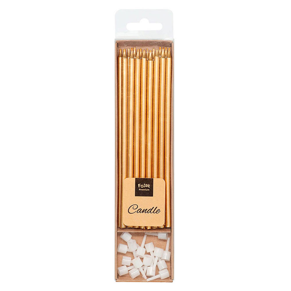 Långa Tårtljus Metallic Brons omfattar 16 stycken metallic bronsfärgade tårtljus som är ca 15 cm långa. Medföljer även vita tårtljus hållare som du enkelt sätter på ljusen för att hålla dem på plats på tårtan.