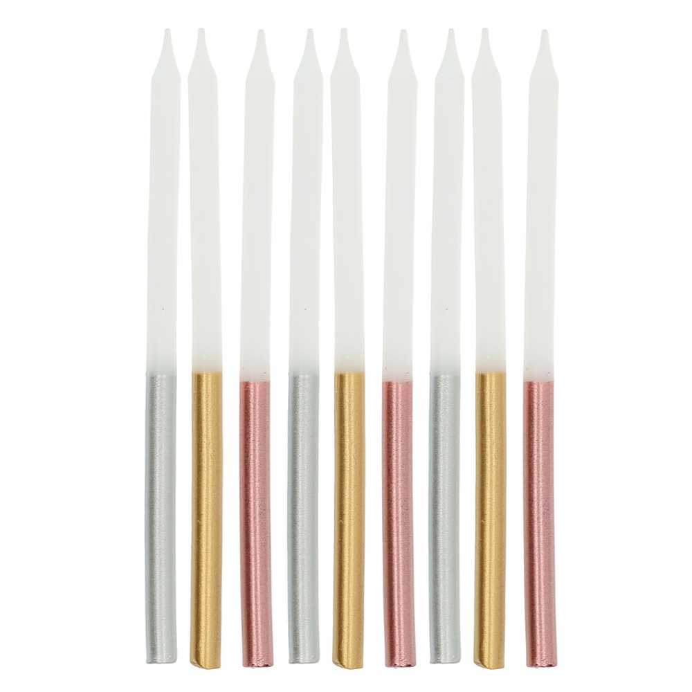 Långa Tårtljus Metallic Glamour omfattar långa och smala tårtljus med metallic färger i guld, silver och roséguld nertill, och vit färg upptill. Ljusen är ca 10 cm långa och säljs i 24-pack, kommer med medföljande ljushållare i vit plast.