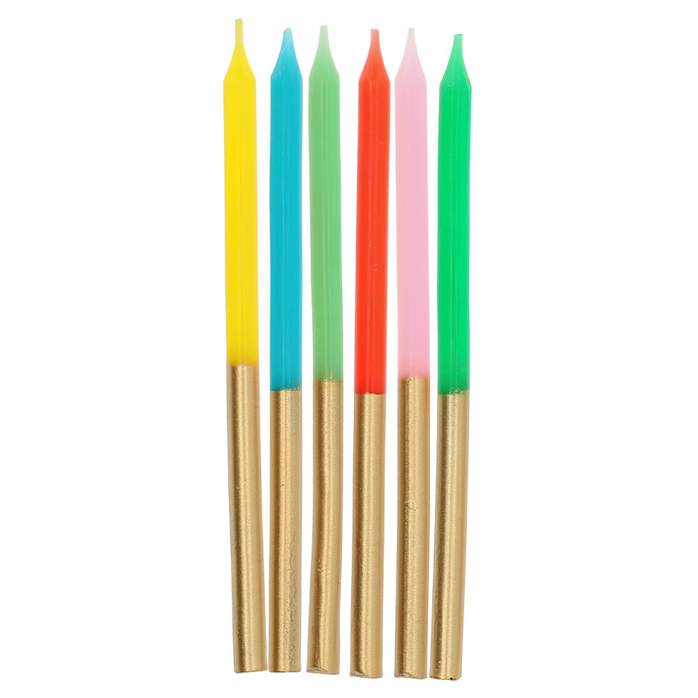 Långa Tårtljus Metallic Retro omfattar 24 stycken långa och smala tårtljus i metallic guldfärg och olika färgglada retrofärger. Ljusen är ca 10 cm långa, ljushållare i vit plast medföljer.