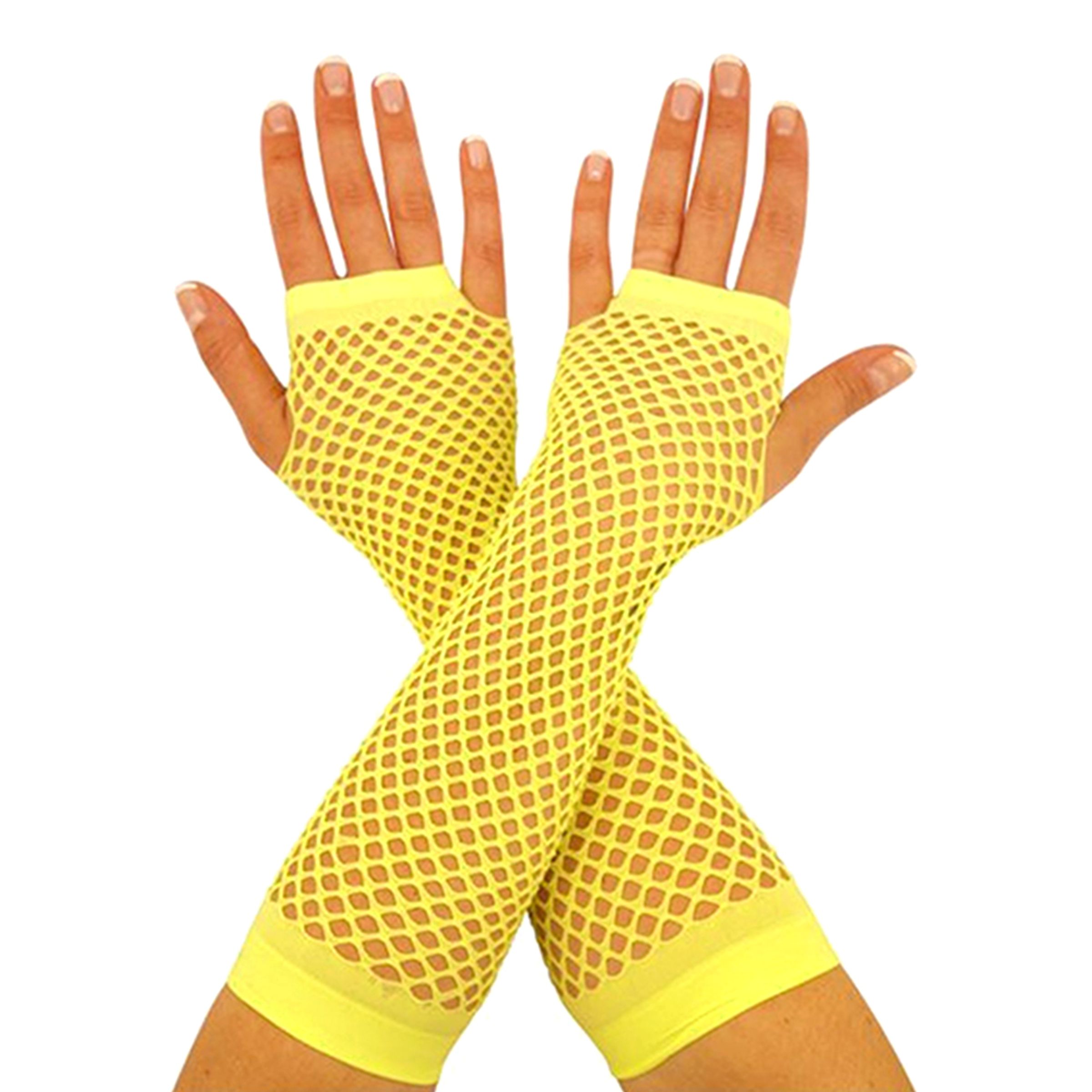 Coola långa fingerlösa näthandskar i fyra olika färger. Handskarna är färgade med en speciell UV-färg som lyser i direkt UV-ljus (t.ex på krogen eller under en UV-lampa). Säljes parvis med två i ett