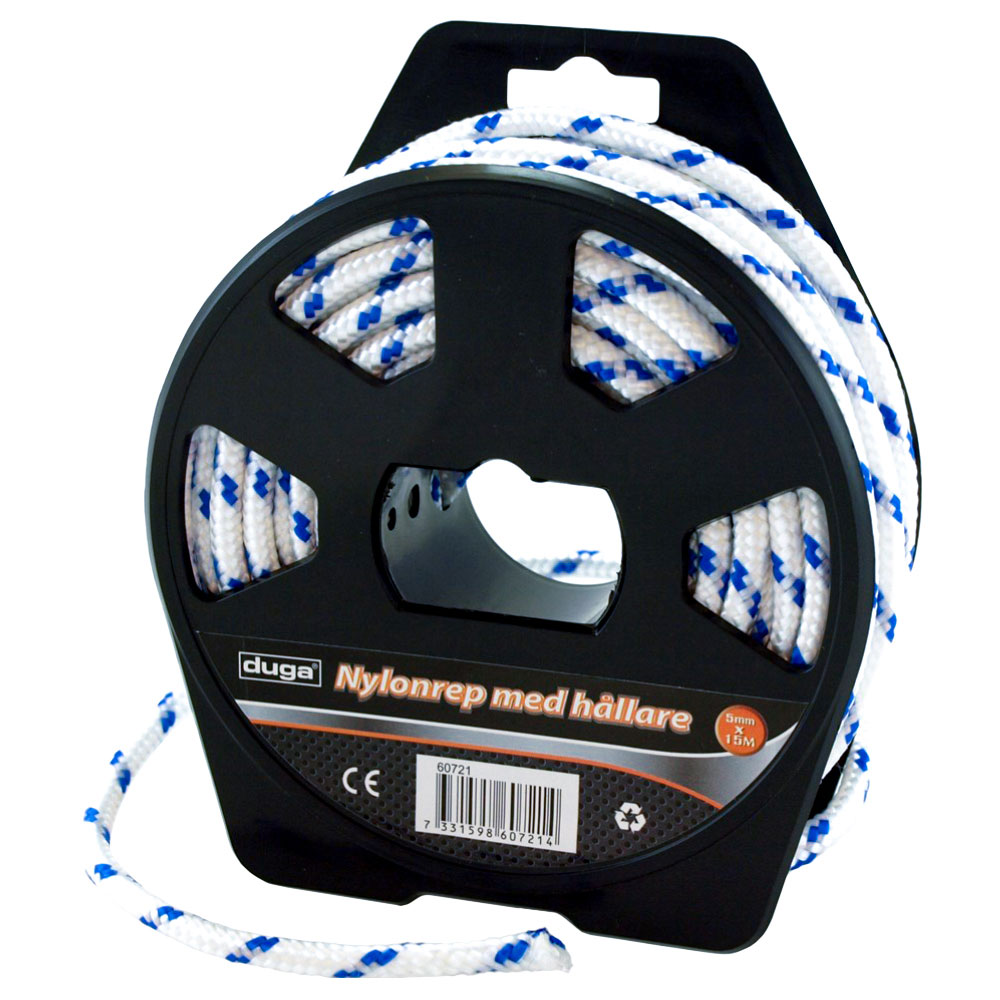 Nylon-rep i vitt och blått för dig som vill ha ett kraftigt flätat rep på rulle. Detta praktiska nylon-rep med rephållare kan användas till en mängd olika saker, perfekt rep för dig som pysslar, fixar och donar i trädgården eller garaget.