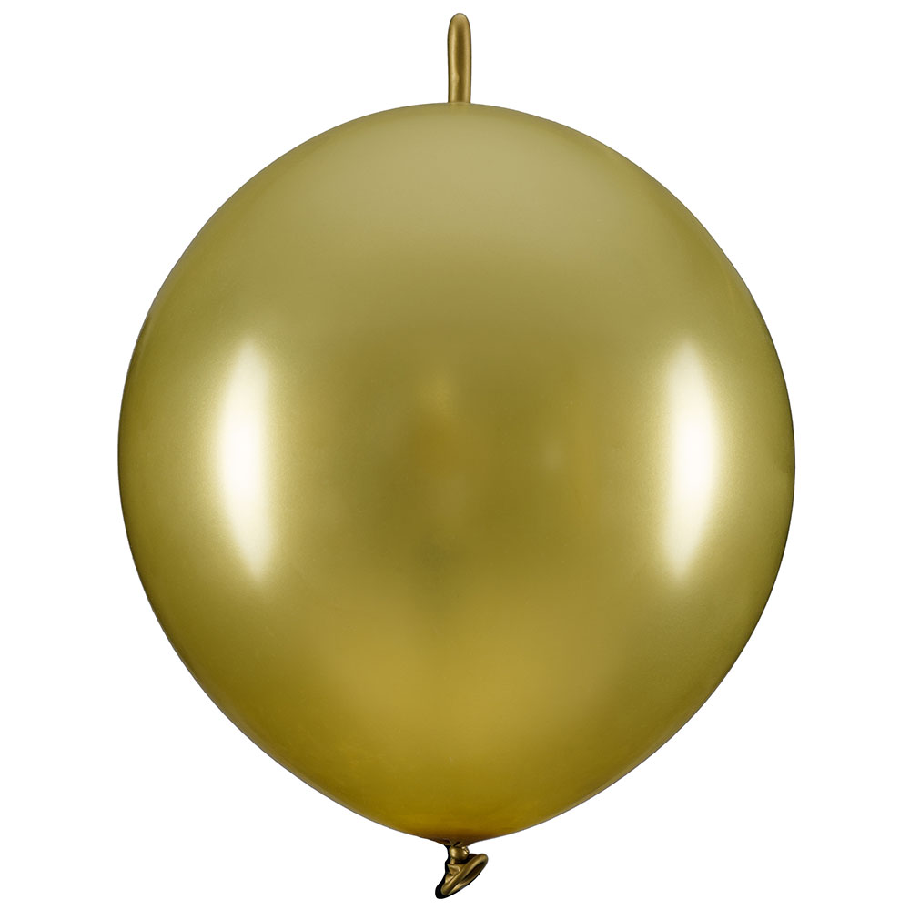 Länkande Latexballonger Guld 20-pack består av tjugo länkande latexballonger i guld, som binds ihop för att skapa en dekoration.