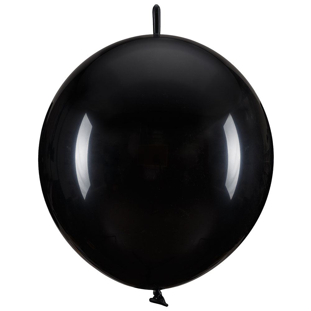 Länkande Latexballonger Svart 20-pack består av tjugo länkande latexballonger i svart, som binds ihop för att skapa en dekoration.