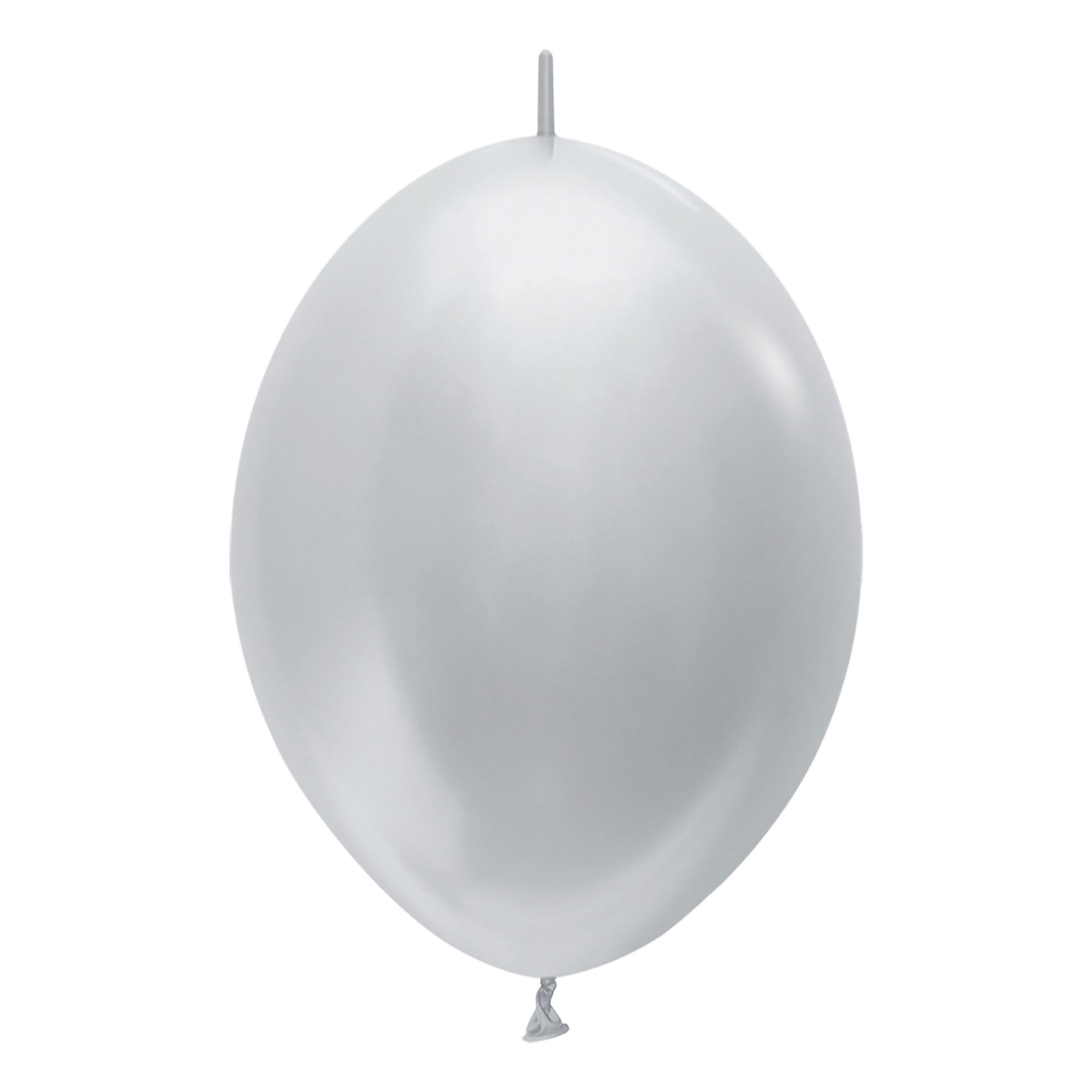 Länkballonger Silver Metallic är latexballonger som kommer med ett extra långt munstycke och flärp på toppen som gör att de lätt kan bindas ihop till en lång kedja för att bilda en läcker ballonggirlang / ballongkedja / ballongbåge. Fyll enkelt ballongerna med luft, bind och dekorera fritt!