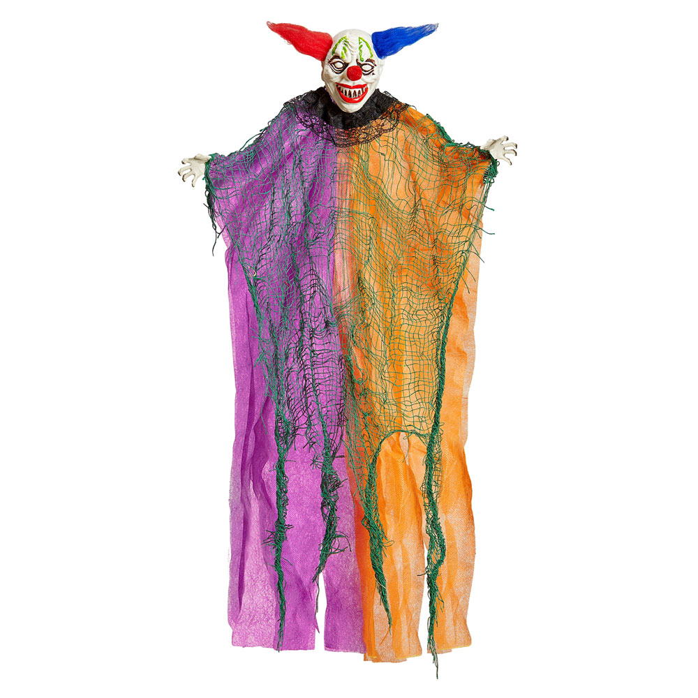 Läskig Clown Hängande Dekoration omfattar en ca 66 cm stor hängande clowndekoration av plast, bomull och polyester. Clownen har en lång, orange-lila klädsel, utstickande hår och läskigt ansikte med clownsmink.
