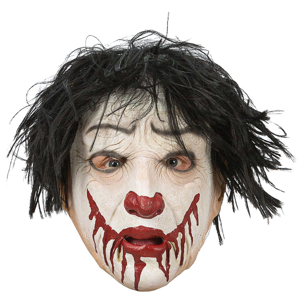Läskig Clown Mask med Hår omfattar en latexmask som föreställer en läskig skräck-clown för vuxna med vit, röd och svart clownsminkning samt svart hår. Masken täcker hela huvudet och har hål för ögon, näsa och mun.