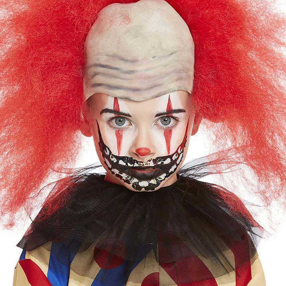 Läskig Clown Sminkset omfattar ett sminkset för en läskig clownsminkning för barn. Setet kommer med vattenbaserade ansiktsfärger i rött, vitt och svart, en sminkmall för läskig clownmun, en sminksvamp och en sminkpensel.