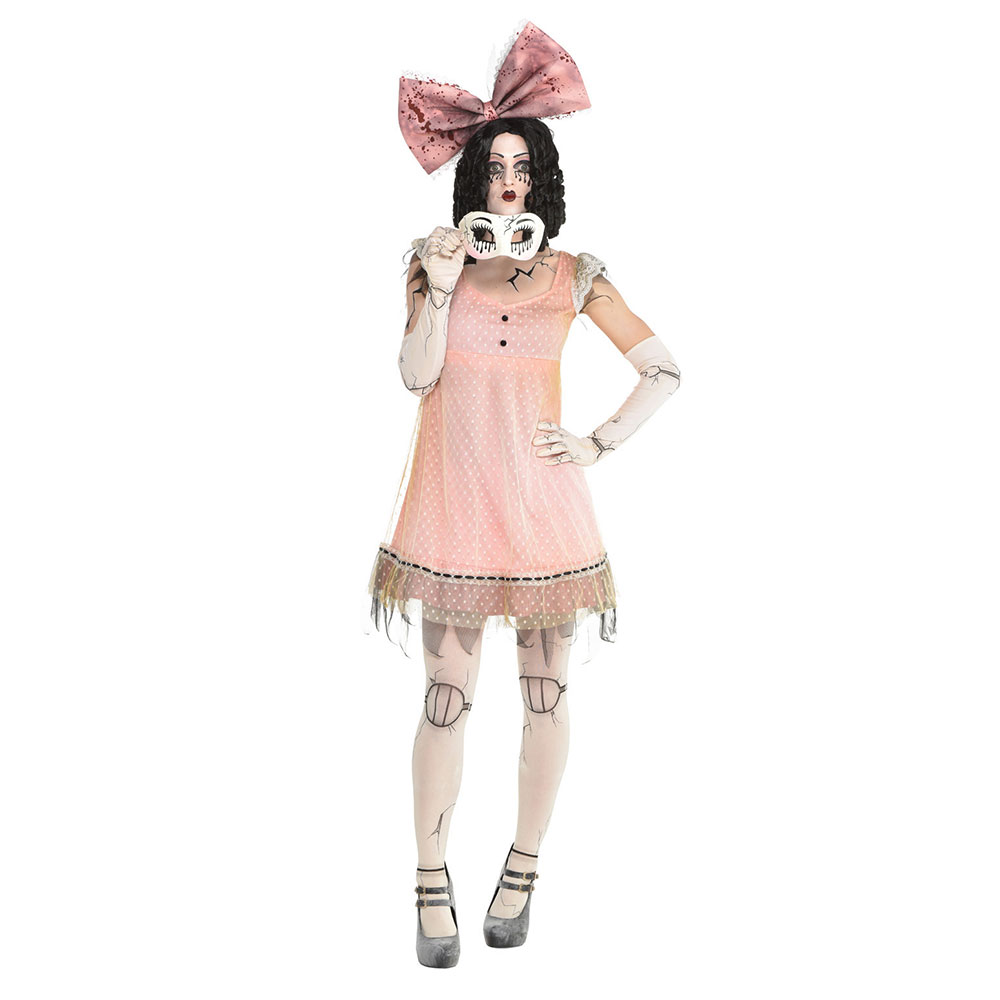 Läskig Docka Maskeraddräkt omfattar en rosa klänning som är täckt av ett gulnat tylltyg med vita och svarta spets- och nättygsdetaljer på ärmar och nedtill, ett diadem med en stor rosa rosett med blodstänk, samt handskar, leggings och mask mönstrat att se ut som en gammal trasig porslinsdocka.