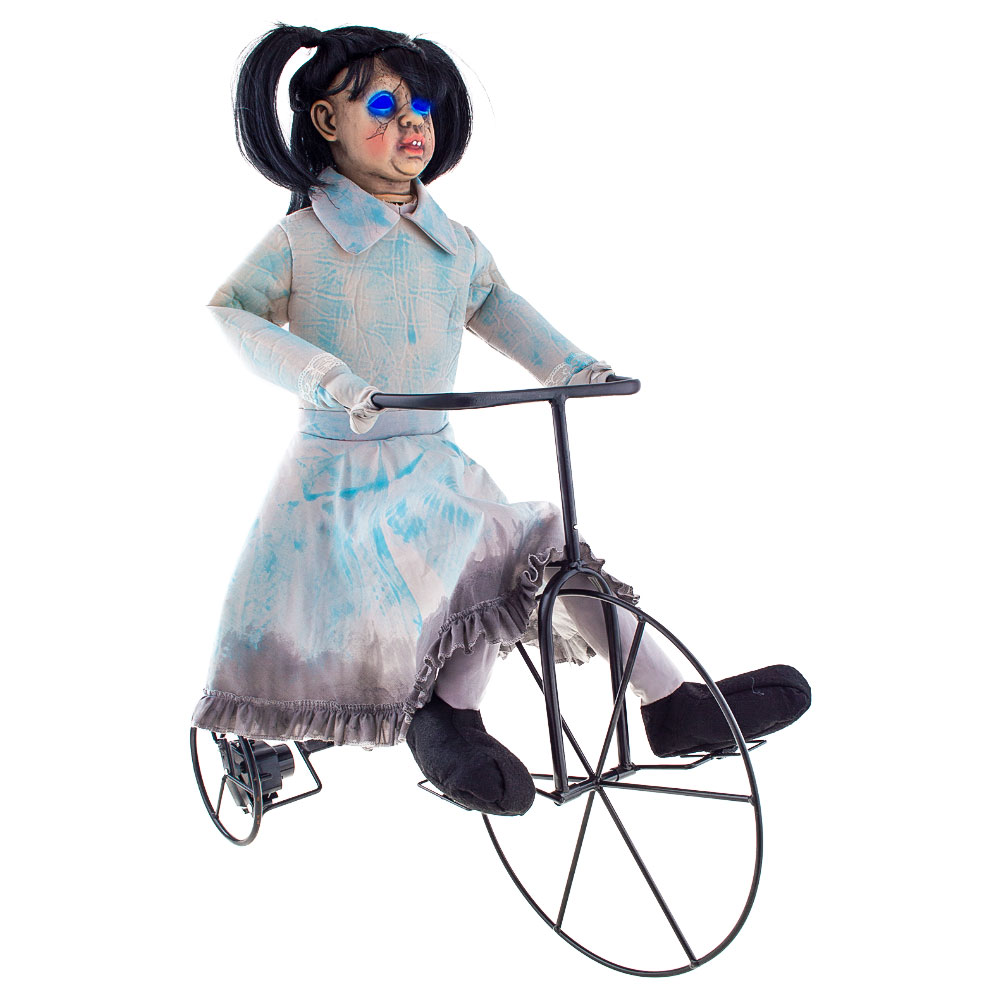 Läskig Flicka på Trehjuling Prop omfattar en halloweendekoration i form av en flicka på en trehjuling. Flickan har lysande ögon och cyklar fram och tillbaka samtidigt som hon skrattar och en kuslig melodi spelas upp. Dekorationen aktiveras när någon kommer nära den. Dekorationen är ca 85 cm hög och drivs av 4 x AA-batterier.