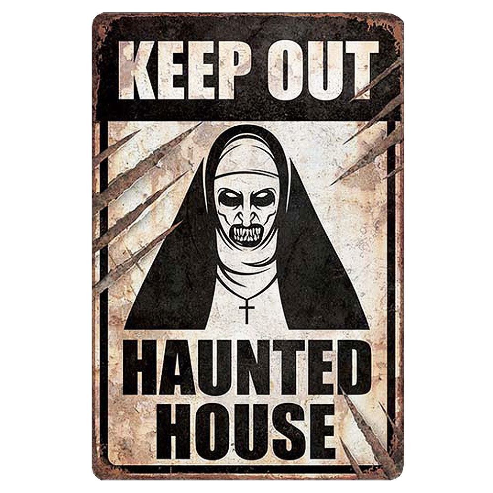 Skräm iväg oinbjudna gäster med denna läskiga skylt med en otäck nunna med sylvassa tänder, perfekt dekoration för alla som vill skoja till det lite under Halloween fest och maskerad. Med en kuslig nunna, ett haunted house och en Keep out varning får vi se vem som vågar sig in på Halloween firandet!