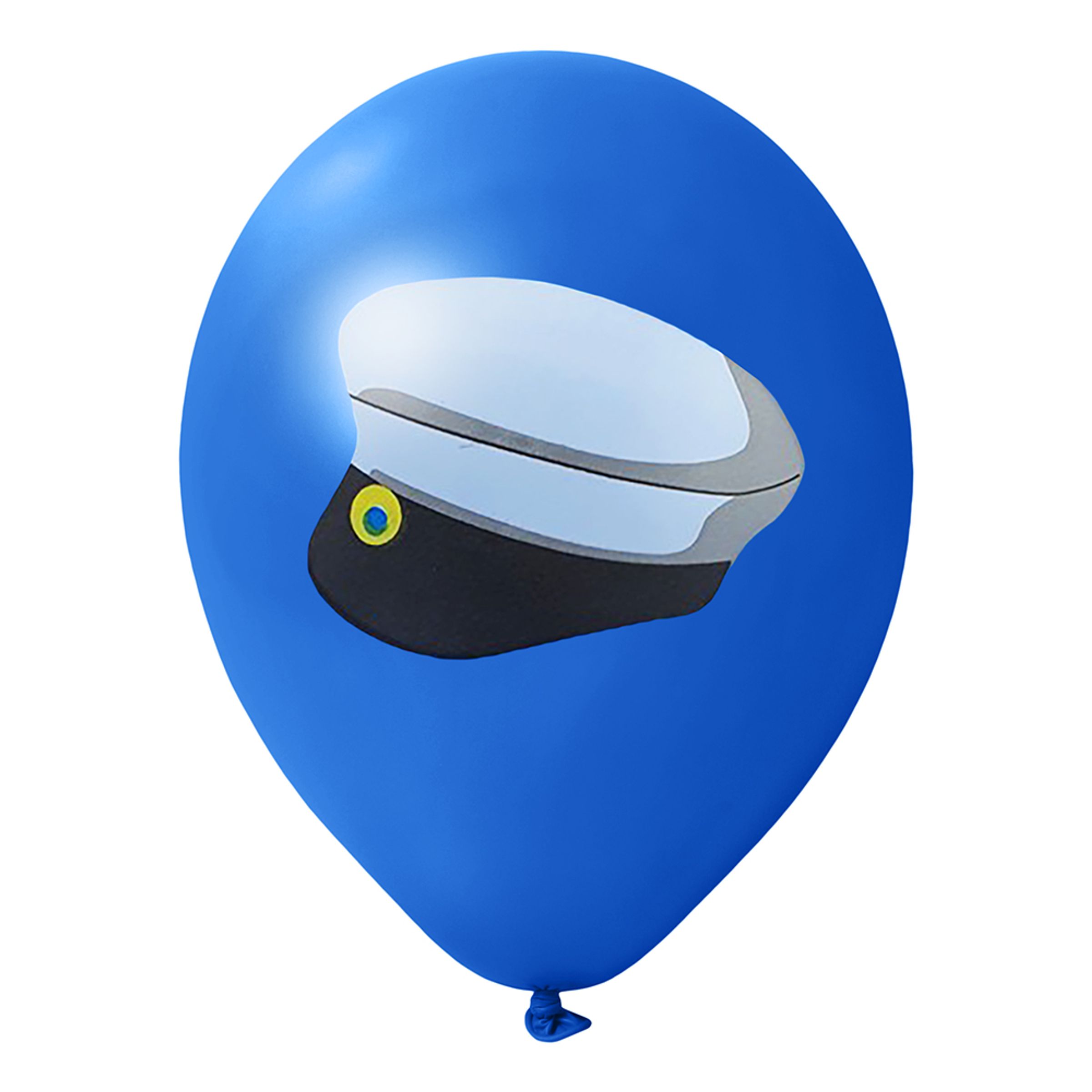 Latexballonger Blåa med Studentmössa inkluderar tolv stycken latexballonger. Ballongerna är blåa med en vit och svart studentmössa. De är 25 cm i diametern när de är uppblåsta och kan fyllas med luft eller helium. Flygtid med helium är upp till sex timmar.