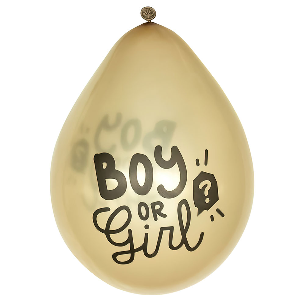 Latexballonger Boy or Girl omfattar ett 6-pack med latexballonger i guld med svart "Boy or Girl?" text. Ballongerna fylls med helium eller luft och blir ca 25 cm stora.