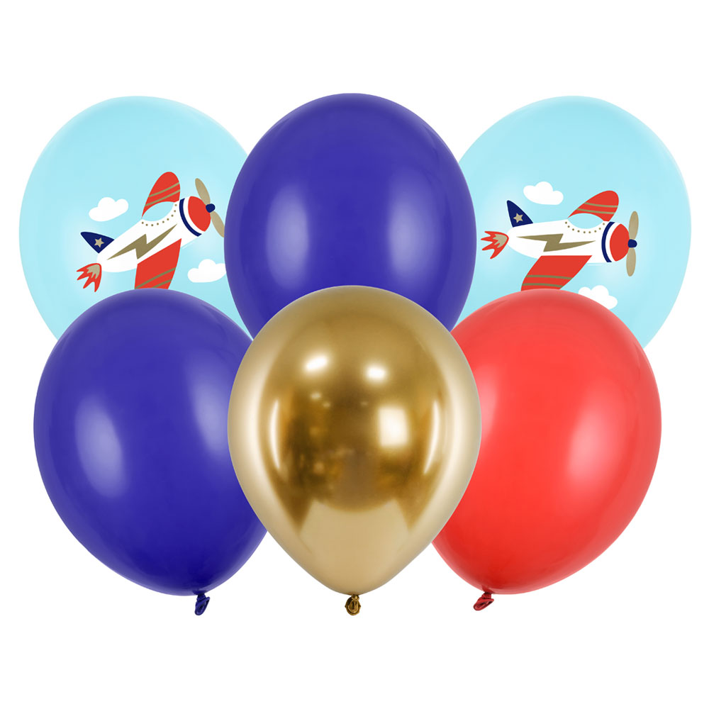 Latexballonger Flygplan Mix omfattar 6 stycken ballonger i latex i en färgmix av ballonger i mörklila, rött, chrome guld samt ljusblåa ballonger vilka har motiv av ett flygplan. Ballongerna rymmer ca 15 liter styck och blir ca 30 cm stora. Fyll med helium eller luft.