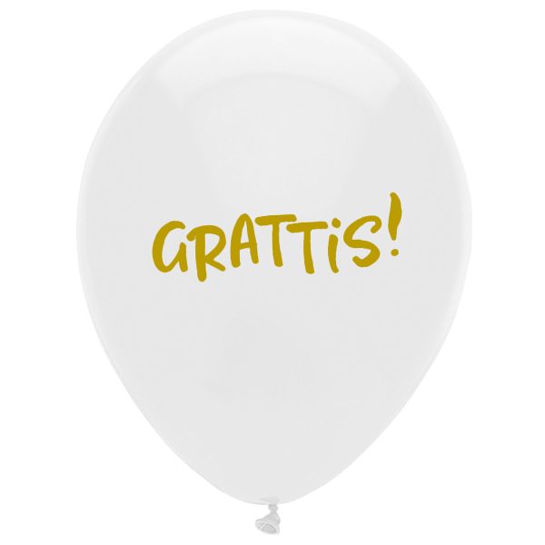 Latexballonger Grattis! 6-pack består av sex vita latexballonger med stjärnor och texten "Grattis!" i grå.