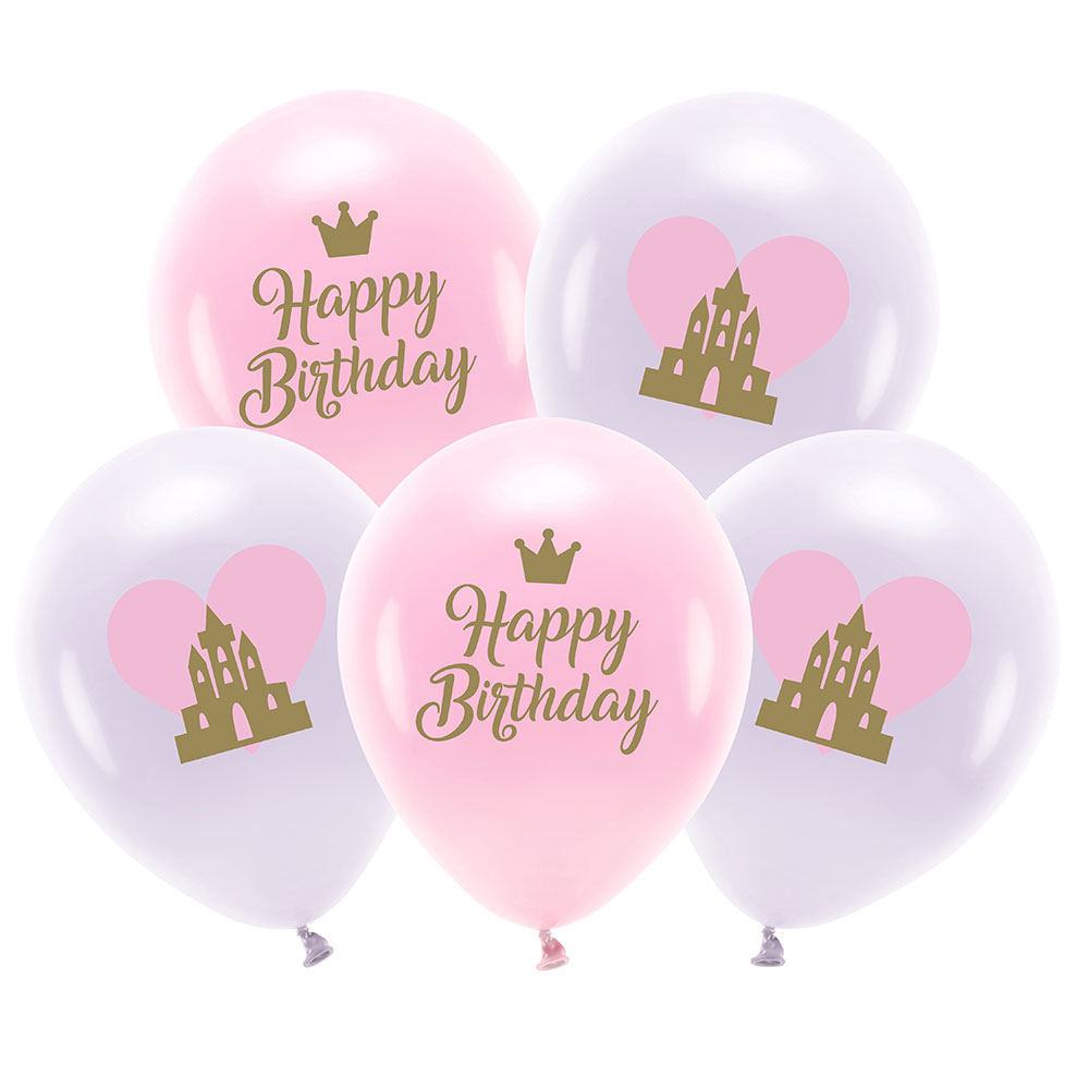 Latexballonger Happy Birthday Prinsessan 33 cm består av fem latexballonger i färgerna ljusrosa och ljuslila med slot motiv och texten "Happy Birthday".