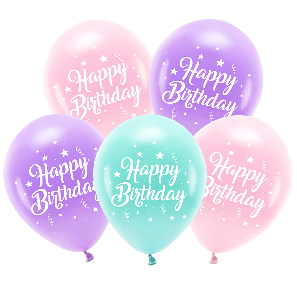 Latexballonger Happy Birthday Rosa 26 cm består av fem latexballonger med texten "Happy Birthday" i färgerna rosa, lila och mintgrön.