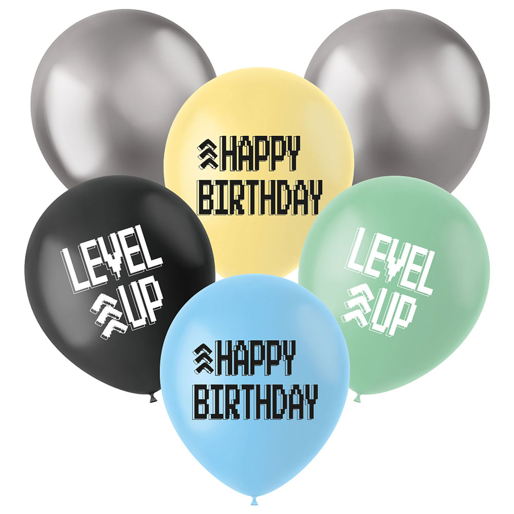 Latexballonger Level Up Birthday 6-pack består av sex latexballonger med gaming motiv i färgerna svart, silver, blå, gul och grön, samt texterna "HAPPY BIRTHDAY" och "LEVEL UP" i svart eller vitt.