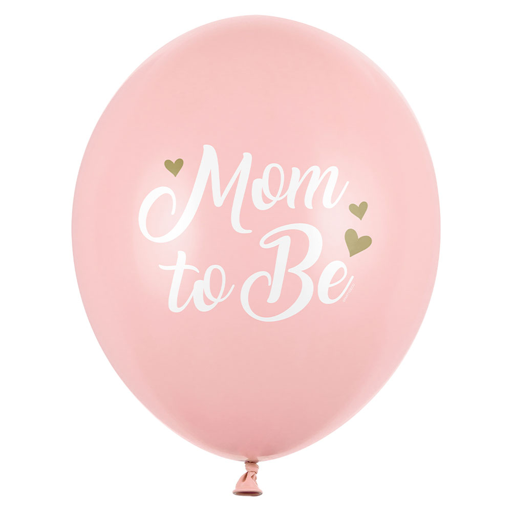 Latexballonger Mom to Be Rosa omfattar rosa latexballonger med tryck "Mom to Be" i vitt och guldhjärtan. Ballongerna fylls med helium eller luft och är ca 30 cm stora.