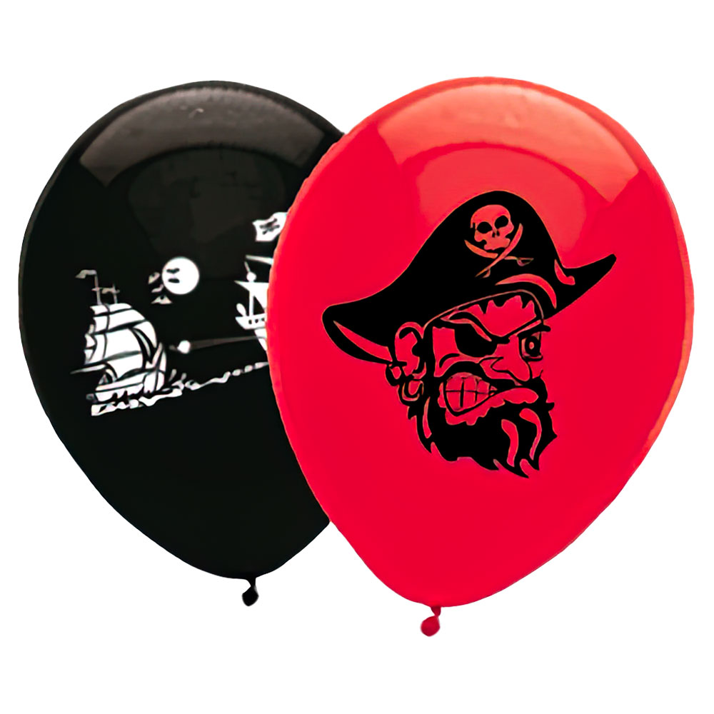 Dags för kalas på det stora piratskeppet? Dekorera med dessa häftiga pirat-ballonger! Dekorativa latexballonger med tuffa motiv av en pirat och piratskepp som helt klart sätter den rätta stämningen inför fartfyllda piratfiranden. De snygga nyanserna av svart, rött och vitt är enkla att matcha och passar helt perfekt in på varje piratkalas. Perfekta ballonger för alla pirater!