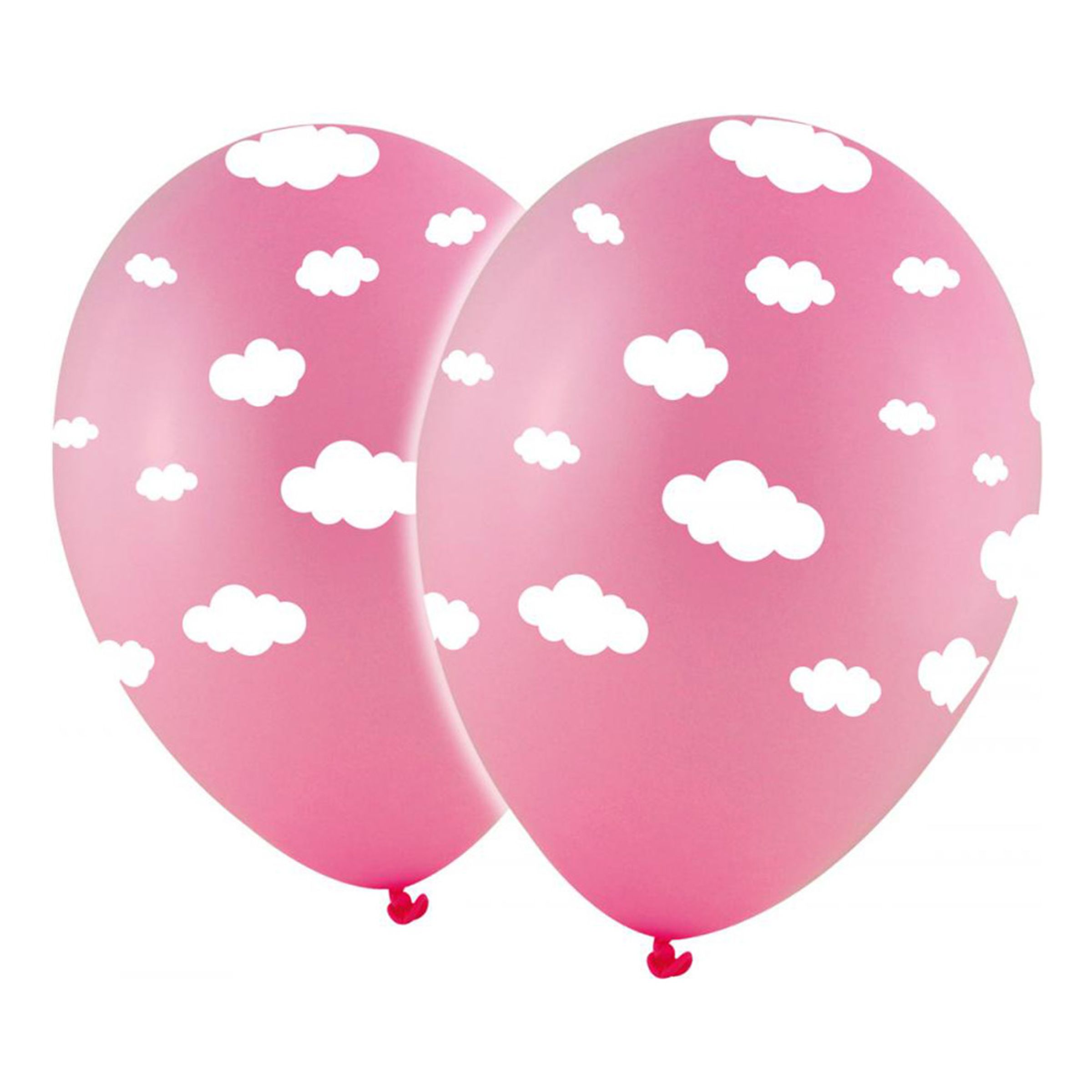 Latexballonger Rosa med Vita Moln inkluderar 10 stycken rosa latexballonger med vita små moln. Ballongerna blir 28 cm i diameter när de är uppblåsta. De kan fyllas med luft eller helium. Flygtid med helium är upp till sex timmar. Ballongerna är tillverkade i Spanien och är biologiskt nedbrytbara. Varje ballong har en lyftkraft på 10 g.