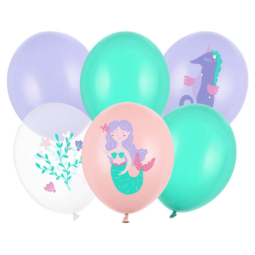 Latexballonger Sjöjungfru Mix omfattar ett 6-pack latexballonger i pastell lila, pastellgrön, pastellrosa och transparent. Tre av ballongerna har varsina motiv av sjöhäst, sjöjungfru och sjöväxter. Ballongerna fylls med luft eller helium och blir ca 30 cm i diameter och rymmer ca 15 liter styck.