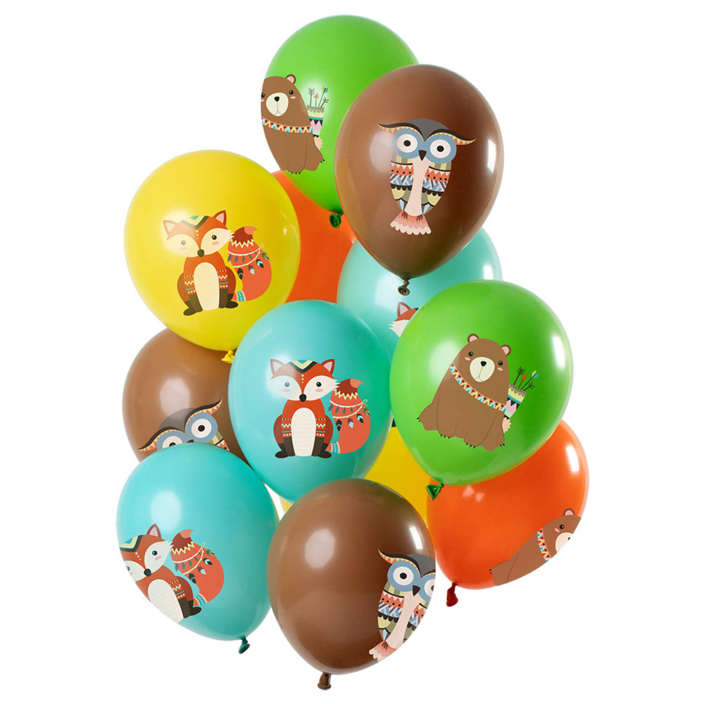 Latexballonger Skogsdjur innehåller 12 latexballonger i blått, grönt, gult, orange och brunt med motiv av björnar, ugglor och rävar.