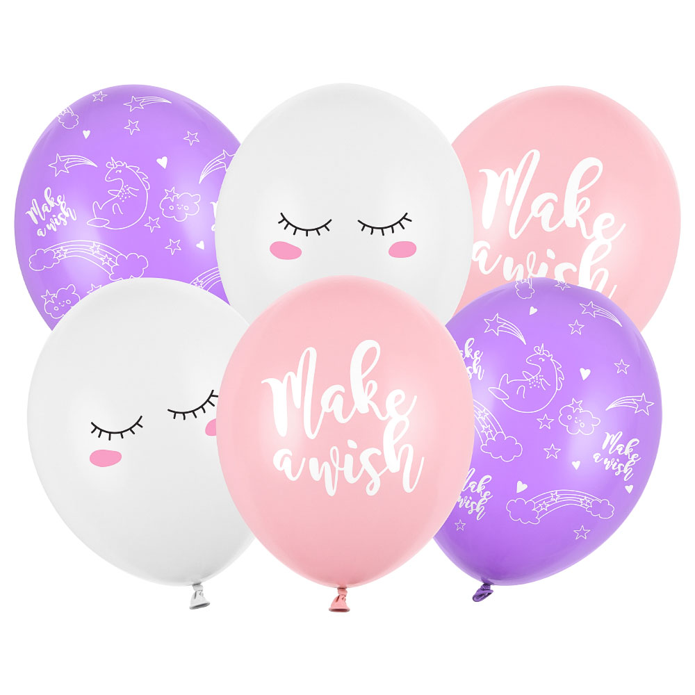 Latexballonger Unicorn Mix omfattar ett 6-pack latexballonger i vitt, rosa och lila med texten "Make A Wish" samt olika motiv av enhörningar, regnbågar, ögonfransar, stjärnor och hjärtan. Ballongerna fylls med luft eller helium och blir ca 30 cm stora.