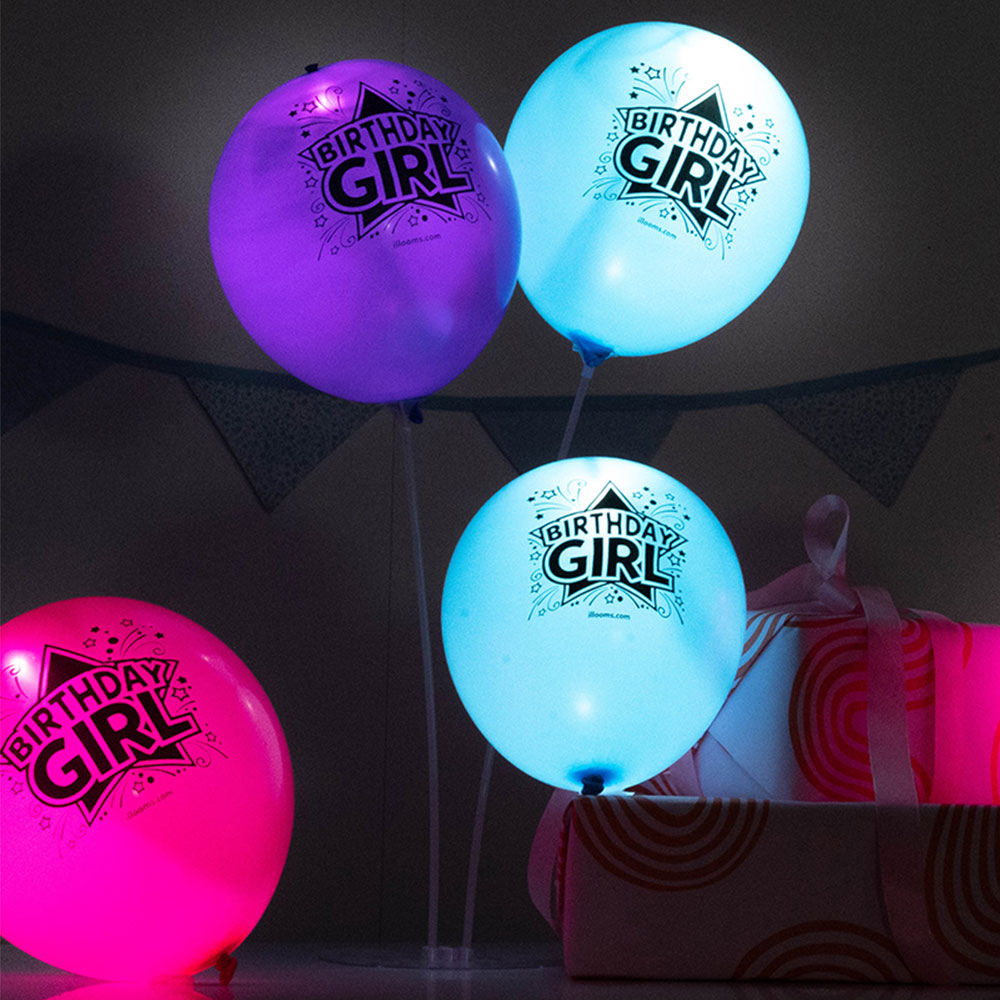 LED Ballonger Birthday Girl omfattar en förpackning med 5 st upplysbara ballonger i olika färger, som har motiv av en stjärna med texten 'Birthday Girl'. Inuti varje ballong finns en liten LED-lampa som aktiveras när du drar ut en flärp.