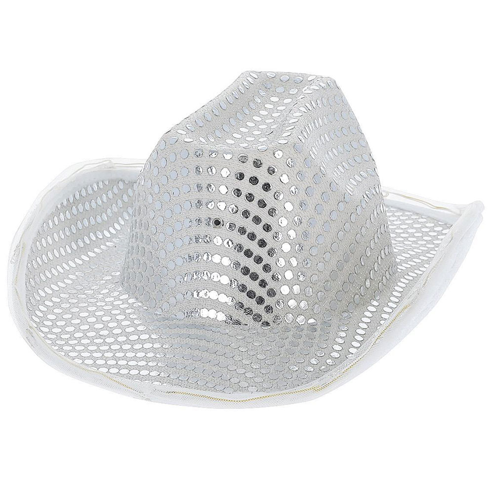 LED Cowgirl Hatt Silver är en vit cowgirl hatt täckt i silvriga prickar och en ljusslinga med LED-lampor längst med skärmen. Batterier till LED-lamporna ingår men är ej utbytbara.