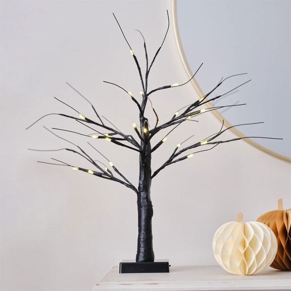 LED Dekorationsträd Svart består av en 40cm hög dekoration i form av ett träd, med lösa grenar som du kan forma precis som du vill. Varje gren är kopplad till en LED lampa, vilket ger trädet en väldigt fin lysande effekt, perfekt inför exempelvis Halloween. Trädet står på en medföljande svart platta. Drivs av 3st AA-batterier (ingår ej).