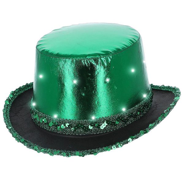 LED Hög Hatt Metallisk Grön är en hög hatt med en metallisk grön färg, paljett- och glitterdetaljer längst kanten och på bandet samt LED-lampor med tre olika inställningar. Batterier till LED-lamporna ingår men är ej utbytbara.
