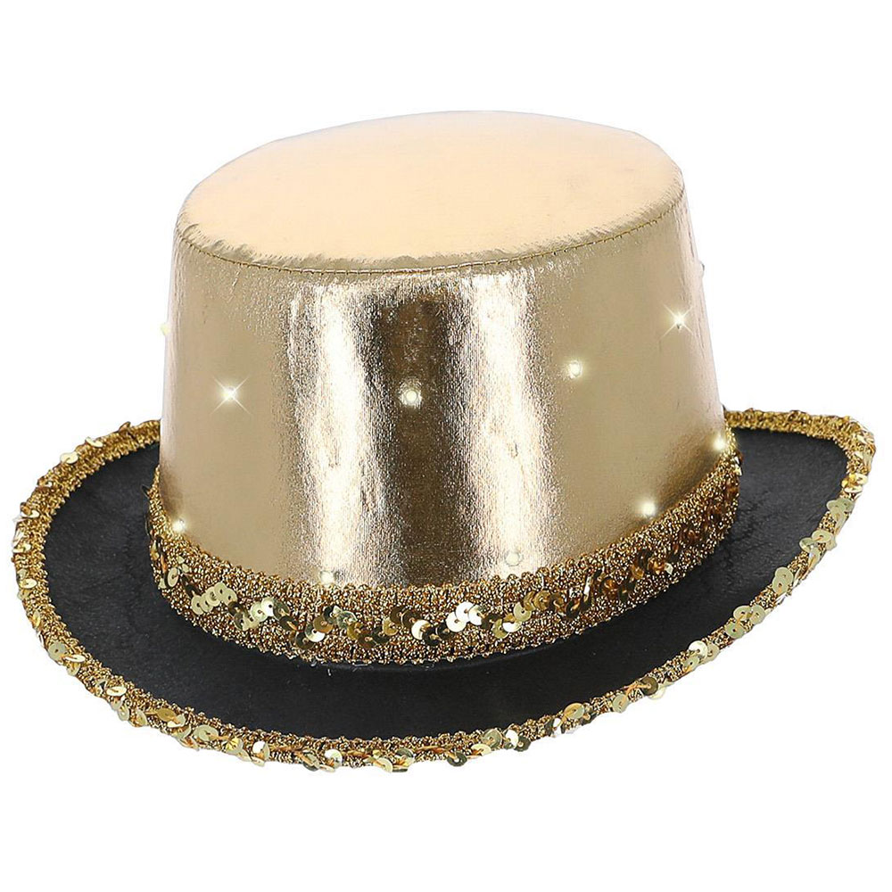 LED Hög Hatt Metallisk Guld är en guldhatt med en metallisk guldfärg, paljett- och glitterdetaljer längst kanten och på bandet samt LED-lampor med tre olika inställningar. Batterier till LED-lamporna ingår men är ej utbytbara.