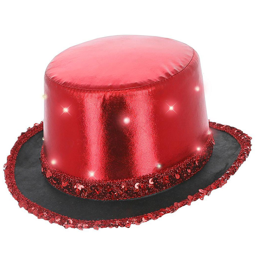 LED Hög Hatt Metallisk Röd är en hög hatt med en metallisk röd färg, paljett- och glitterdetaljer längst kanten och på bandet samt LED-lampor med tre olika inställningar. Batterier till LED-lamporna ingår men är ej utbytbara.