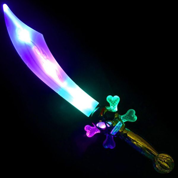 LED Light Up Böjt Piratsvärd omfattar ett leksakssvärd i form av ett böjt piratsvärd med ett vitt blad, guldfärgat handtag med högtalare, en on/off knapp och en dödskalle. Drivs med fyra stycken LR44 batterier som ingår.