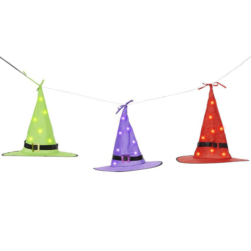 LED Light Up Hängande Häxhattar omfattar en ljusslinga med LED-lampor och tre stycken häxhattar i lila, grön och rött med glitterdetaljer. Drivs med två stycken AA batterier, ingår ej.