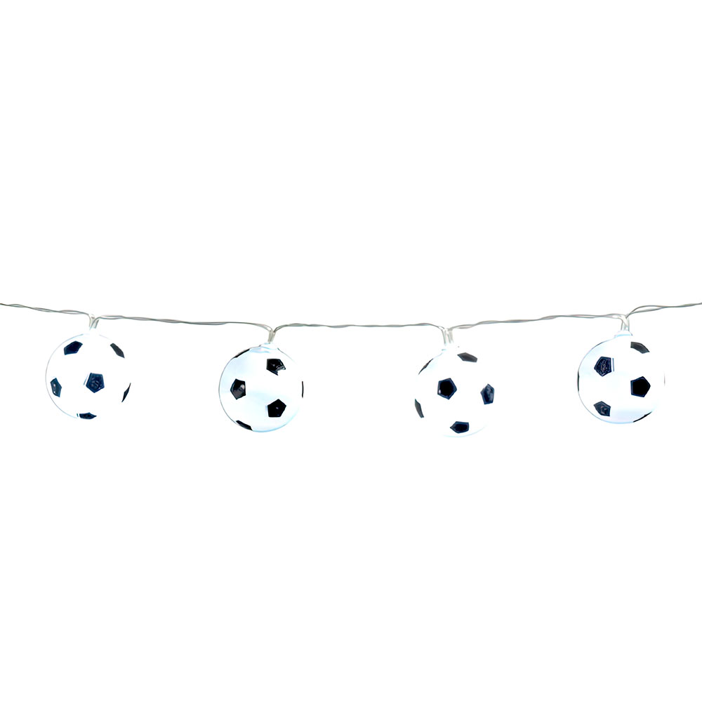 Fotboll är livet och såklart ska fotbollskalas och fotbollsfest firas med denna snygga ljusslinga full av fotbollar och LED belysning med batteri, perfekt dekoration för alla som vill ha mysig fotbolls anda inomhus till fest och kalas med tema fotboll, med en batteridriven slinga får du riktigt mysigt ljussken perfekt för långa och mysiga fotbollskvällar med skönt fotbollstema.