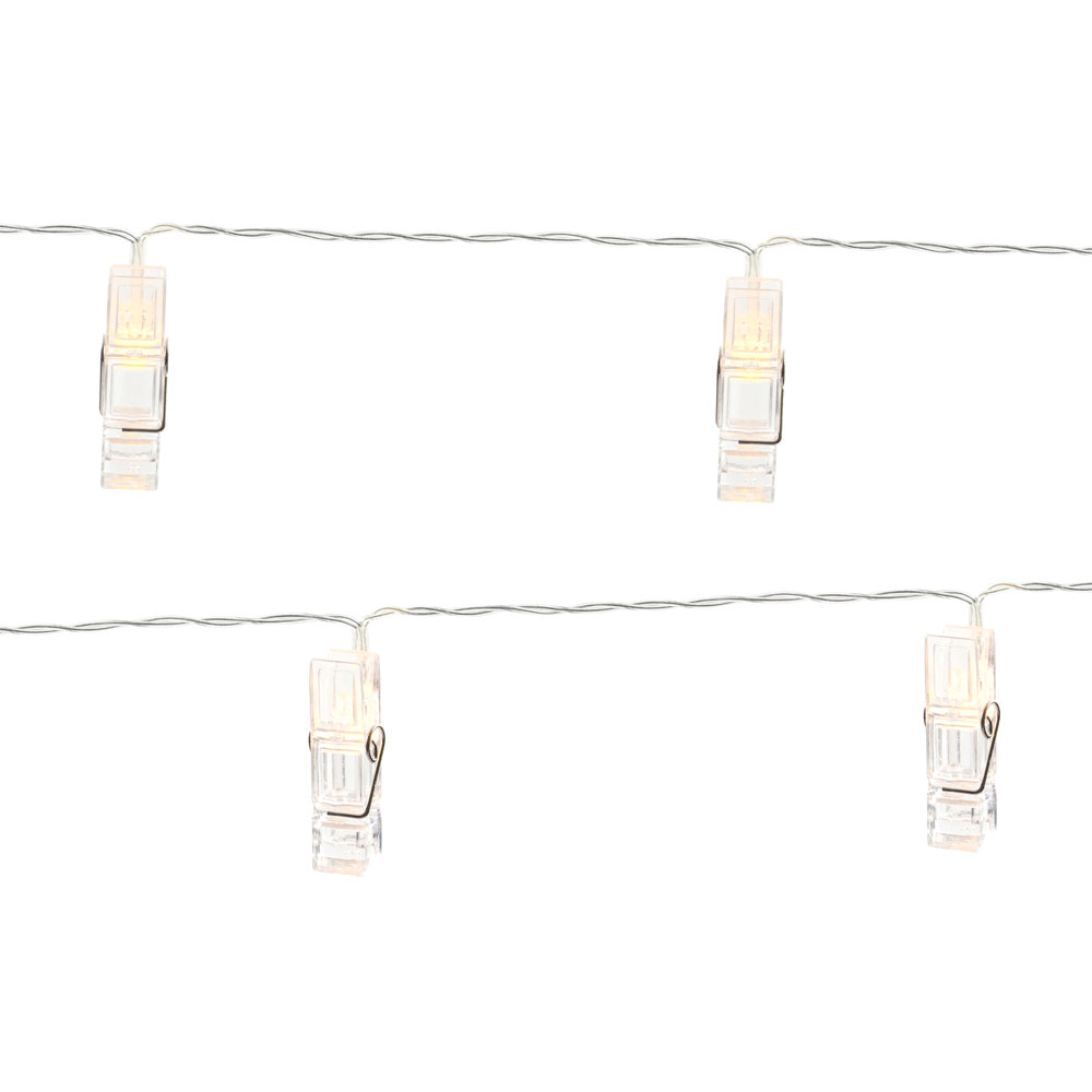 LED Ljusslinga med Klämmor omfattar en LED ljusslinga med 10 stycken transparenta, lysande klämmor att fästa foton i. Ljusslingan har ett varmt gult sken och drivs av 2 st AA-batterier. Ljusslingan är ca 1,4 meter lång och kan endast användas inomhus.