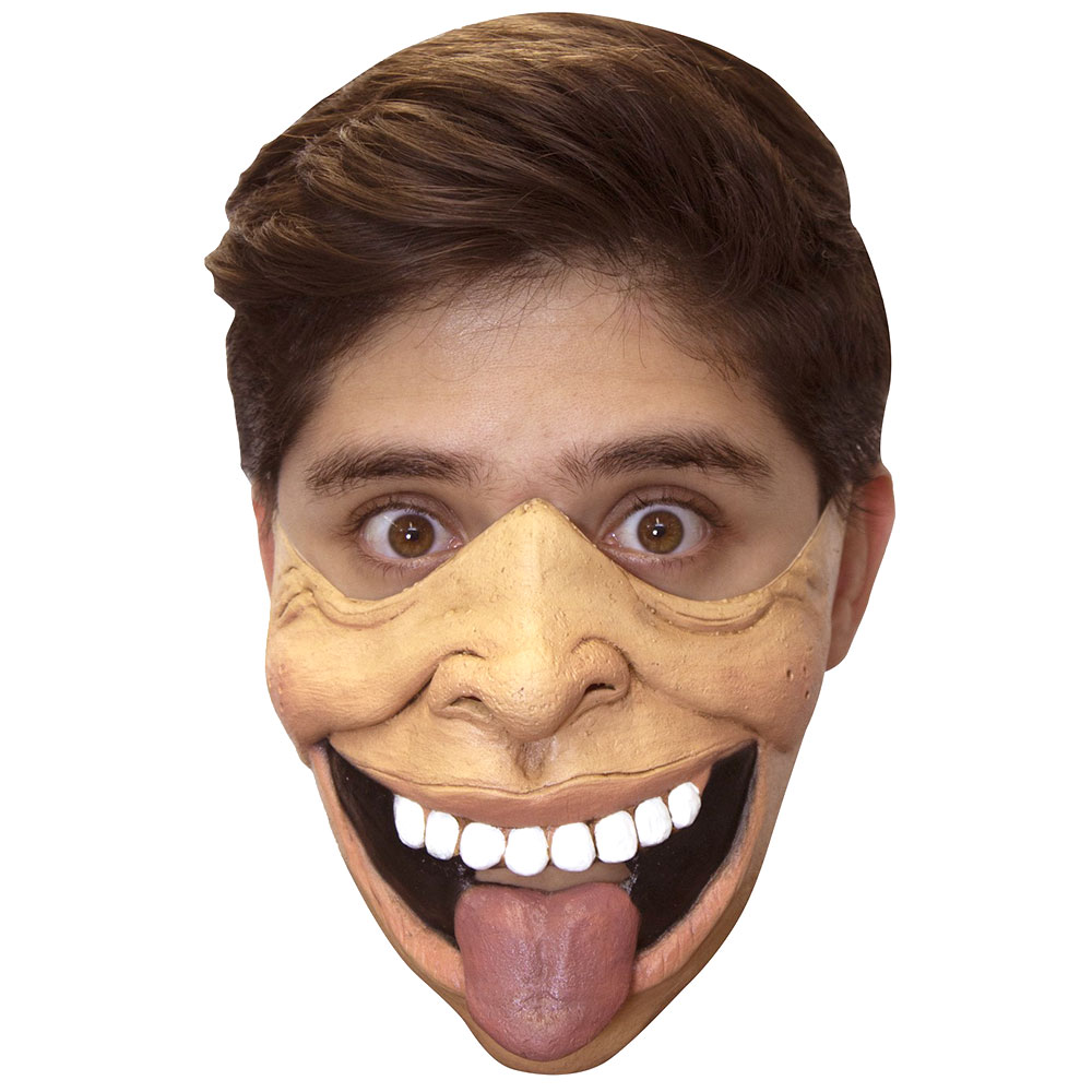 Leende Halvmask omfattar en beige halvmask med öppen mun och utstickande tunga. Masken har hål för näsa och mun och hålls på plats med ett svart elastiskt band.