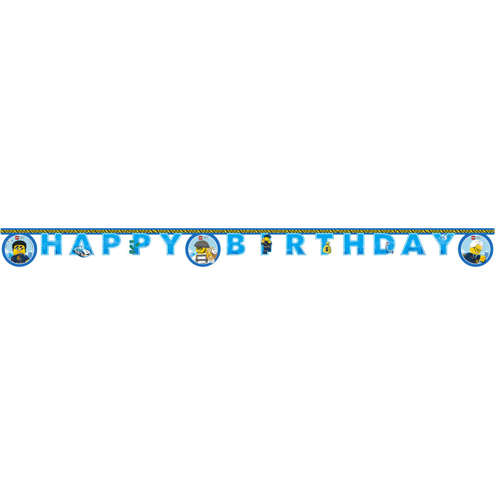 Lego City Happy Birthday Girlang omfattar en blå bokstavsgirlang med Lego City motiv i olika färger och texten "Happy Birthday". Girlangen är ca 2 meter lång och hängs upp med vitt snöre. Motiven är ca 15,5 cm höga och 16 cm breda.