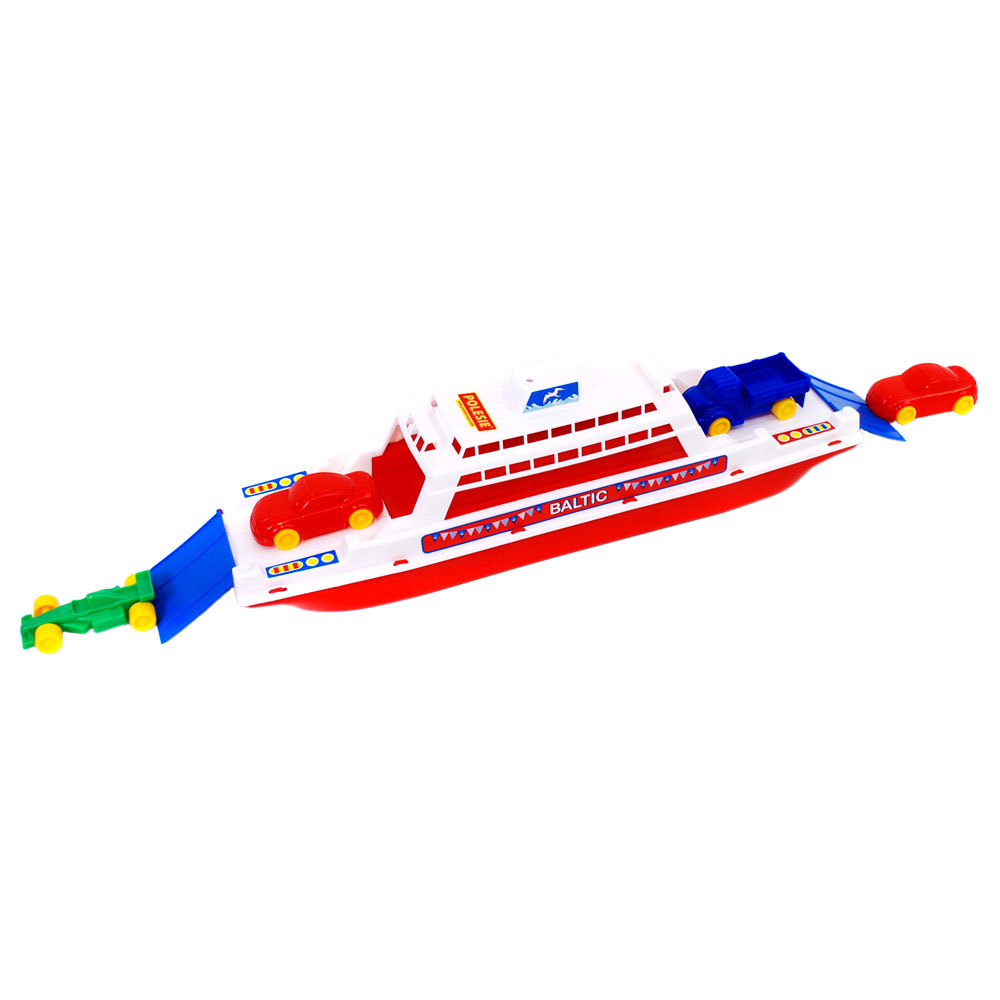 Leksaksfärja med bilar omfattar en leksaksfärja i plast med fyra små bilar och två nedfällbara ramper.