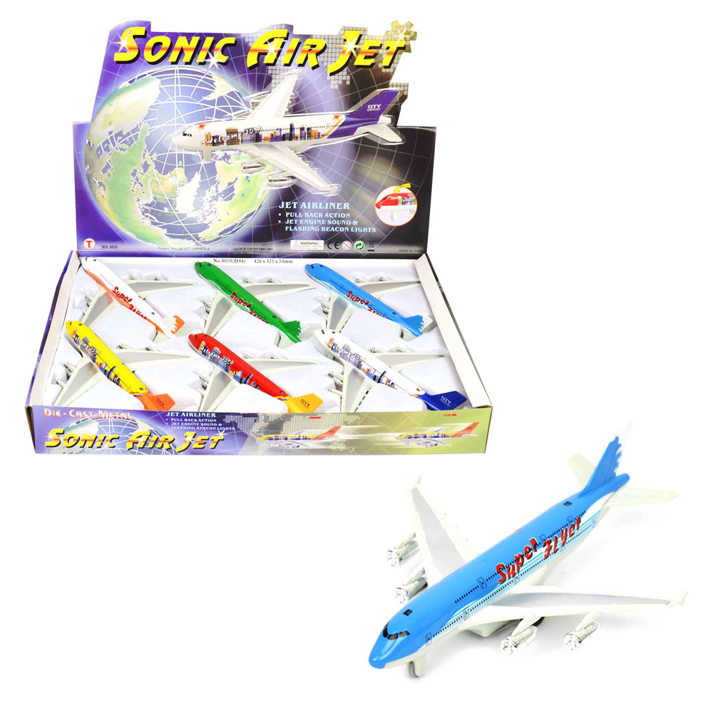 Leksaksflygplan med Ljud och Ljus omfattar ett leksaksflygplan av plast med ljud och ljus. Flygplanet är ca 19 x 16 cm stort och finns i flera olika färger, vilken färg du får slumpas.