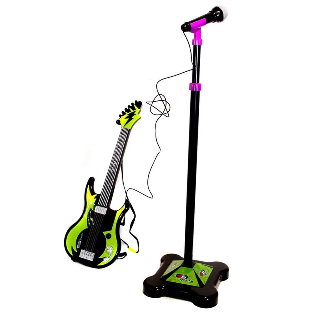 Leksaksgitarr och Mikrofon omfattar en svart och grön leksaksgitarr med ljud och axelrem samt en matchande leksaksmikrofon med stativ.