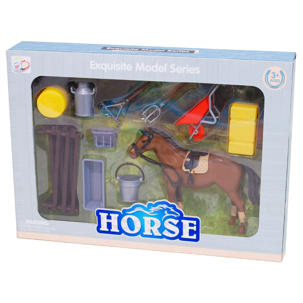 Se hit alla hästälskare, här kommer ett super kit med en fin leksakshäst full av skojiga tillbehör, allt du behöver för att din hästleksak ska ha det bra med halm, matskålar, kratta och såklart staket så inte din leksaks häst rymmer sin väg, en både fin och rolig leksak för alla som gillar djur och såklart hästar.