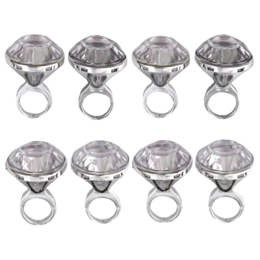 Leksaksringar med Diamanter innehåller 8 stycken silverfärgade ringar för barn med en stor diamant.