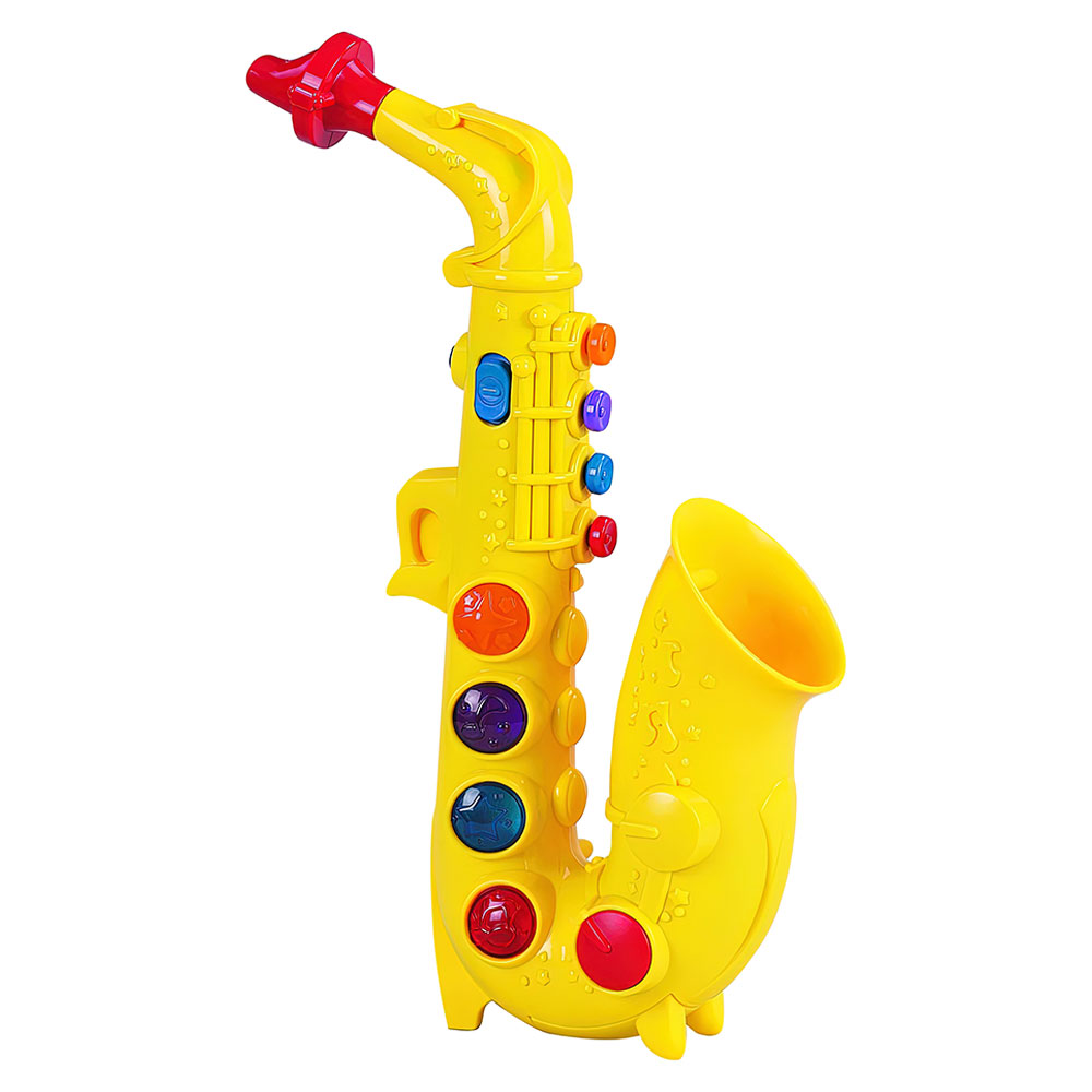 Leksakssaxofon omfattar en gul leksakssaxofon med fyra olika spellägen, fyra olika musikknappar och blinkande ljus. Saxofonen drivs av 2 st AA-batterier och passar barn från 18+ månader. Tillverkad av plast.