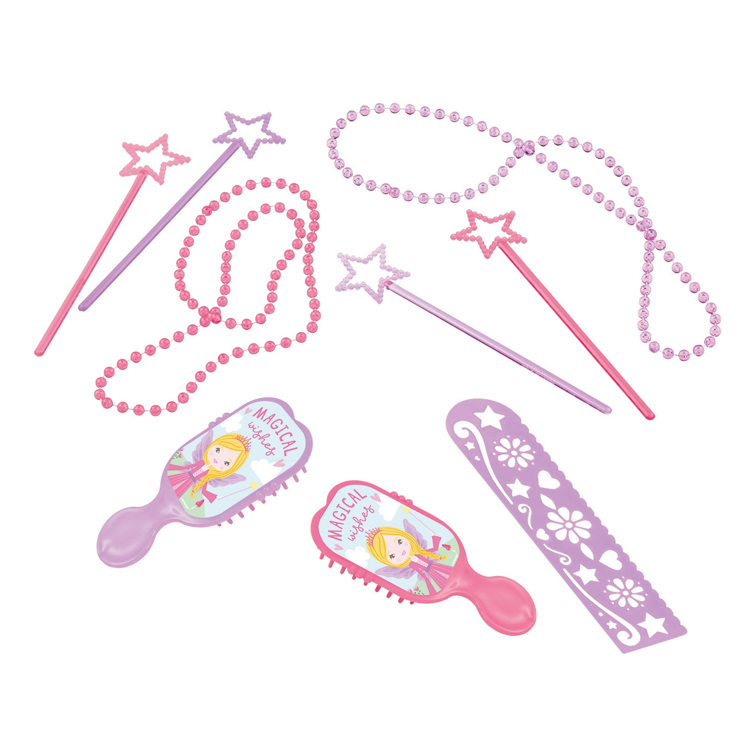 Leksaksset Prinsessa inkluderar hårborstar, halsband, linjaler och trollstavar i färgerna lila och rosa. Perfekta saker att lägga i gåvopåsarna på kalaset!